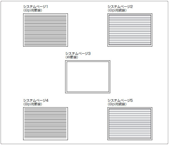 本製品には、横罫線、枠取り、行網掛けなど、汎用的な定型フォームが5種類ほど登録されています。あらかじめ保有しているこのオーバーレイページをシステムページといいます。