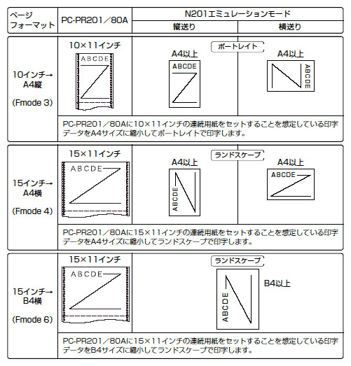 本エミュレーションモードの7種類のページフォーマットについて説明します。それぞれのページフォーマットでは、PC-PR201/80Aプリンターと同等の印字結果を得られるように、印字データの縮小方法や、印字領域などが決められています。
