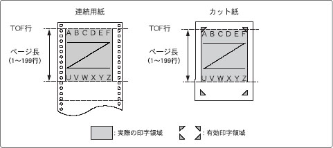 それぞれのページフォーマットで決められている印字可能行数を越えるページ長を設定した場合は、この設定に関わらず、印字可能行数で改ページが行われます。なお、VFCグループの「ミシン目スキップ」でミシン目スキップ行数が設定されている場合は、実際の改ページ位置が変わります。