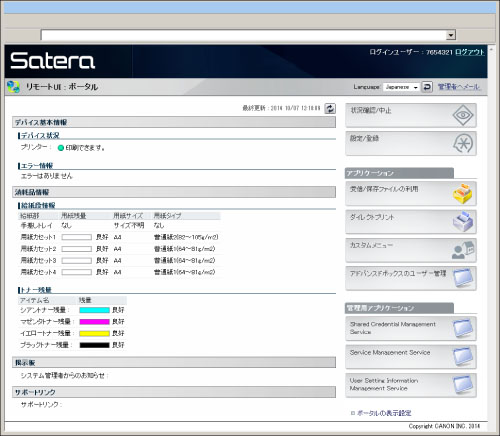 リモートUIでは、ネットワーク経由で本製品にアクセスして、現在の状況や各種情報、ジョブの処理状況などを表示できます。本製品の前に行かなくても、離れた場所からコンピューターで本製品を管理できます。Webブラウザーで本製品のIPアドレスを指定すると、次のようなリモートUIのトップページが表示されます。