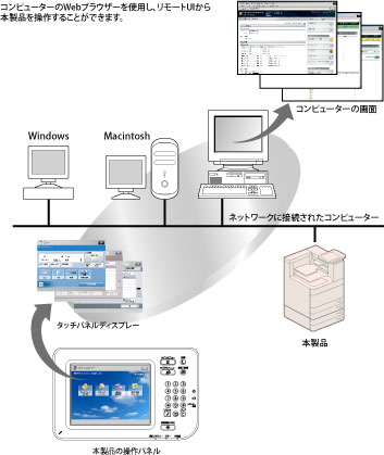 リモートUI(UserInterface)は、お手持ちのWebブラウザーからネットワークを経由して本製品にアクセスし、本製品の状況の確認やジョブの操作、各種設定などができるソフトウェアです。リモートUIを使用するためのソフトウェア(Webサーバー)は本製品に内蔵されているので、Webブラウザー以外のソフトウェアを用意する必要はありません。ネットワーク上で本製品がコンピューターとつながっていれば、リモートUIを使うことができます。