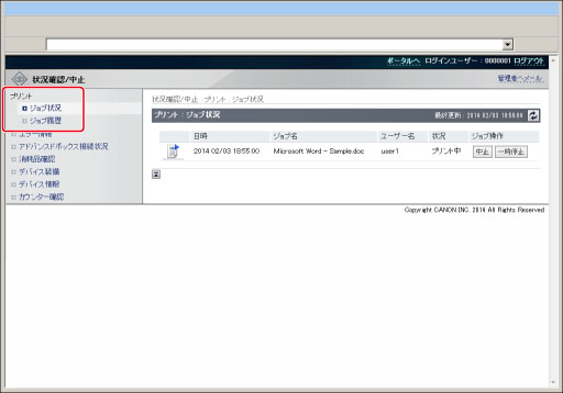 ボックスやアドバンスドボックスなど、本体からのプリントジョブ履歴を表示します。