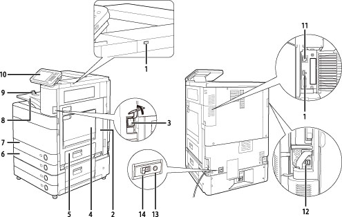 本製品を操作するのに必要な、キーやタッチパネルディスプレー、ランプなどがあります。(→操作パネル各部の名称とはたらき)
