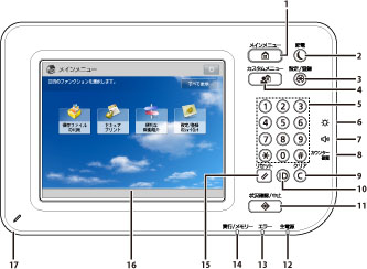 カスタムメニューとして登録した、よく使用する機能の設定を呼び出すときに押します。また、認証機能を使用している場合には、ユーザーごとに設定したカスタムメニュー画面を表示させることができます。(→カスタムメニュー)