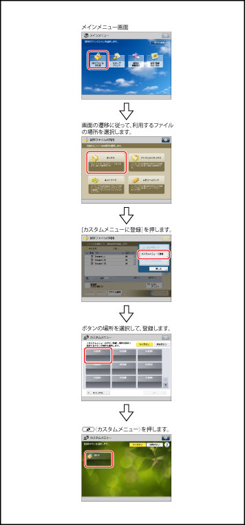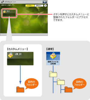 カスタムメニューは、よく印刷する文書を保存しているフォルダーへのショートカットをボタンとして登録することができます。