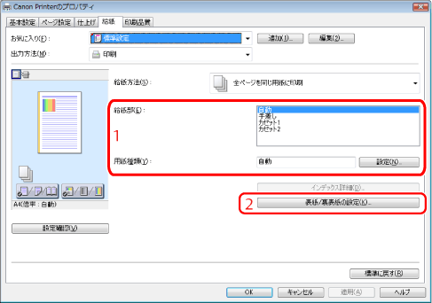 特定の用紙に印刷したい場合、その用紙がセットされている給紙部やその用紙種類を指定します。