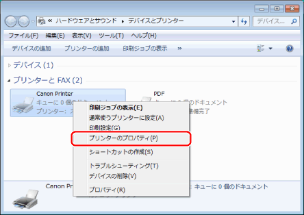 ](スタート)→[コントロールパネル]→[プリンタ]をクリックします。Windows XP/Server 2003の場合は、[スタート]→[プリンタとFAX](または[スタート]→[コントロールパネル]→[プリンタとその他のハードウェア]→[プリンタとFAX])をクリックします。