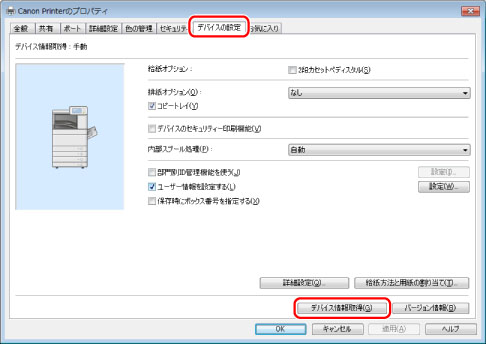 デバイス情報取得がエラーになった場合は、本体に装着されているオプション(給紙カセットなど)を手動で設定してください。