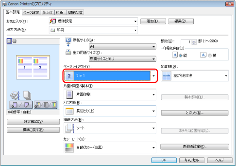 [ページレイアウト]で項目が選択できない場合は、[コントロールパネル]からプリンターのプロパティ画面を表示して[デバイスの設定]タブをクリックしたあと、[内部スプール処理]から[自動]または[必ずホスト側で処理を行う]を選択してください。プリンターのプロパティ画面の表示方法については、「プリンターのオプション設定をする」を参照してください。