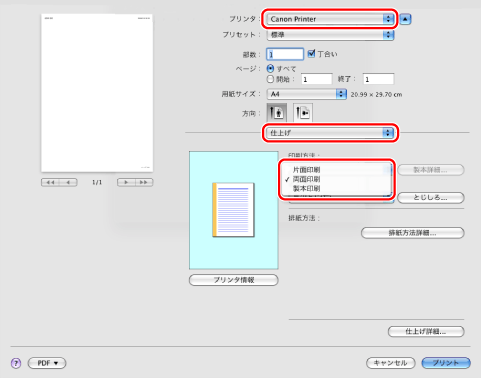 お使いのプリンター→[仕上げ]→[印刷方法]から[両面印刷]を選択