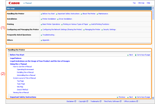 Shows the all chapters and sections of the e-Manual. Click an item to view the contents.