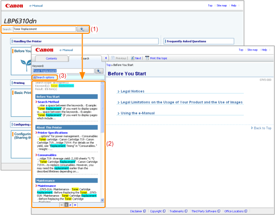 The AND search is available in the e-Manual so you can refine the search results by entering two or more keywords. When entering keywords, enter a space between the keywords.