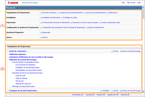 Liste des différents chapitres et sections du manuel électronique. Cliquez sur une entrée pour afficher le sommaire correspondant.