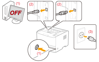 Se questi elementi cadono o vengono versati all'interno della stampante, spegnere immediatamente l'unità dal pulsante di accensione (1) e scollegare i cavi d'interfaccia, se collegati (2). Scollegare infine il cavo di alimentazione dalla presa di corrente (3) e rivolgersi al rivenditore autorizzato Canon di zona.