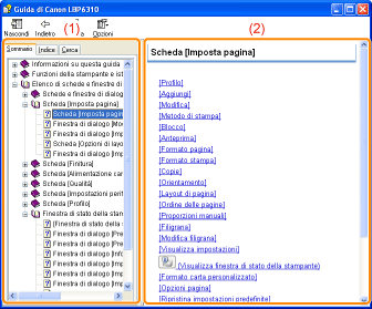 Qui vengono elencati i titoli di schede, finestre di dialogo ecc. Selezionare una scheda, finestra di dialogo o altro contenuto relativo all'opzione desiderata. Scheda [Indice]