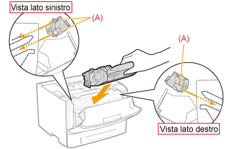 Spingere con decisione la cartuccia del toner nella stampante finché non tocca il retro della stampante, tenendo allineati (A) entrambi i lati della cartuccia alle apposite guide all'interno della stampante.