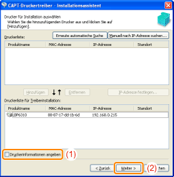 Aktivieren Sie das Kontrollkästchen [Druckerinformationen angeben].