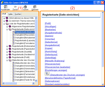 Die Namen der Registerkarten, Dialogfelder usw. werden aufgeführt. Wählen Sie eine Registerkarte, ein Dialogfeld oder Sonstiges für die von Ihnen gewünschte Option aus. Registerkarte [Index]