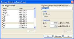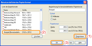 Vergewissern Sie sich, dass das registrierte benutzerdefinierte Papierformat zu [Liste der Papierformate] hinzugefügt wurde.