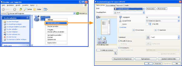Klicken Sie mit der rechten Maustaste auf das Symbol für diesen Drucker, und wählen Sie dann aus dem Kontextmenü [Druckeinstellungen] aus.