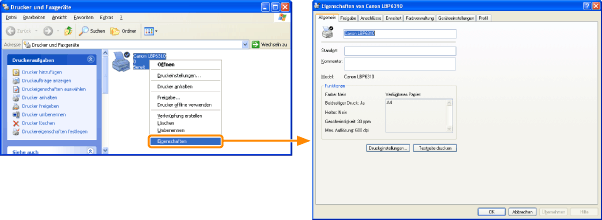 Klicken Sie mit der rechten Maustaste auf das Symbol für diesen Drucker, und wählen Sie dann aus dem Kontextmenü die Option [Eigenschaften] oder [Druckereigenschaften] aus.