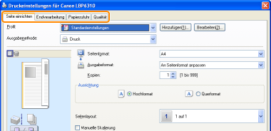 Ändern Sie die Druckeinstellungen auf den Registerkarten [Seite einrichten], [Endverarbeitung], [Papierzufuhr] und [Qualität].
