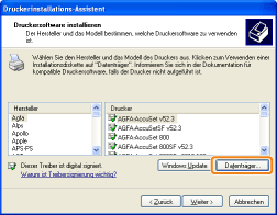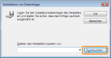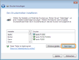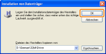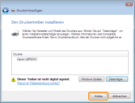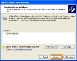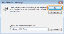 ![]() Wenn der Drucker nicht erkannt wirdFolgen Sie den Anleitungen im Dialog, und suchen Sie erneut nach dem Drucker, oder lesen Sie den Abschnitt "Grundlagen und andere Informationen zur Vorgehensweise unter Windows", und geben Sie einen Wert für [Gerätetyp] an.