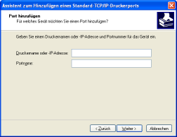 Der Wert, der in dem folgenden Dialog, der beim Einstellen eines Anschlusses angezeigt wird, in [Druckername oder -IP-Adresse] ([Druckername oder IP-Adresse] für Windows 2000) eingegeben wird, variiert abhängig von der Methode zur Festlegung der IP-Adresse des Druckers.