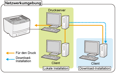 Es gibt zwei Möglichkeiten, den Druckertreiber auf Client-Computern zu installieren: die lokale Installation und die Download-Installation.