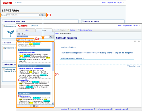 Ejemplo: "Tóner Sustitución" (si desea visualizar páginas que incluyan las palabras "Tóner" y "Sustitución")