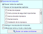 ![]() Las opciones de búsqueda sirven para especificar el capítulo que hay que buscar, para distinguir entre mayúsculas y minúsculas y para especificar si hay que diferenciar entre caracteres de uno y dos bytes.
