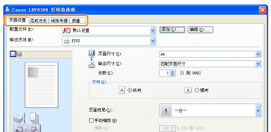 在 [页面设置]、[完成方式]、[纸张来源] 和 [质量] 选项卡中更改打印首选项。