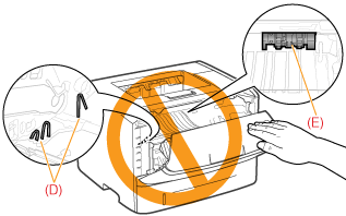 ![]() ![]() 请勿触碰高压触点 (D) 或电触头 (E)。否则可能会损坏硒鼓。
