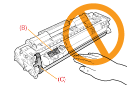 ![]() 请勿触碰电触头 (A) 或硒鼓存储器 (B),请勿打开感光鼓保护盖 (C)。如果触碰电触头 (A) 或硒鼓存储器 (B),可能会导致硒鼓损坏。