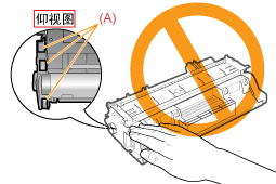 正确抓住硒鼓。如图所示,装卸硒鼓时,使带箭头的一侧朝上,正确地抓住硒鼓。请勿垂直放置或倒置。