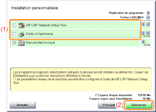 Décochez les cases [MF/LBP Network Setup Tool] et [Pilote d'imprimante].