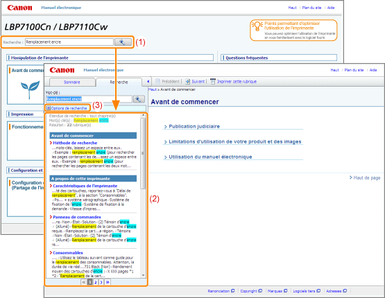 Saisissez une chaîne de caractères dans le champ [Recherche] de la page d'accueil ou dans le champ [Mot-clé] de la fenêtre de recherche, puis cliquez sur [