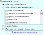 ![]() Utilisez les options de recherche pour restreindre la recherche à un chapitre particulier, indiquer s'il faut tenir compte de la casse ou faire la distinction entre les caractères à un et deux octets.