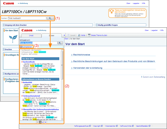 In der e-Anleitung steht auch die UND-Suche zur Verfügung, so dass Sie die Suchergebnisse durch Eingabe von zwei oder mehr Suchbegriffen verfeinern können. Geben Sie bei der Eingabe von Suchbegriffen ein Leerzeichen zwischen den Suchbegriffen ein.
