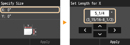 1 | Specify the length of the <X> (shorter) side. Tap <X>. Input the length of the <X> side using  /  , or numeric keys for inputting whole numbers and fractions, and tap <Apply>. |