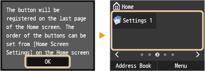 If the Home Screen is full and no more settings can be registered, either delete spaces with <Home Screen Settings> in the Home Screen, or remove registered buttons. Deleting Buttons