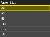 If the screen shown above is not displayed when paper is loadedIf you always load the same paper in the multi-purpose tray, you can skip the paper setting operations by registering the paper size and type as the default setting. When the default setting is registered, however, the screen shown above is not displayed. To display the screen, select <Off> for <Register Default Settings> (Registering Default Paper Settings for the Multi-Purpose Tray).