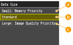 The scanned documents are converted into the specified file formats. At that time, you can specify the file compression ratio. <Small: Memory Priority> makes the compression ratio higher than normal to create smaller files with lower image quality. On the other hand, <Large: Image Quality Priority> makes the compression ratio lower than normal larger files with higher image quality.