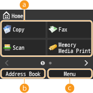 ![]() | Function selection buttonsTap to activate the copy, fax, scan, or USB Print functions. <Address Book>Tap to display a list of destinations registered in the Address Book. Registering in the Address Book <Menu>Displays a menu for settings available with the machine. Setting Menu List |
