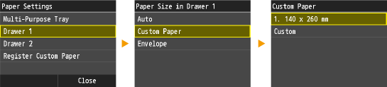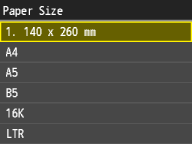 The paper sizes that are registered in the procedure above are displayed on the screen for selecting the paper size.