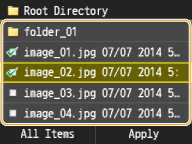 3 | Tap <JPEG/TIFF> or <PDF>. All JPEG/TIFF or PDF format files are selected. If you selected a file before you tap <All Items>, you can only select files of the same format. |