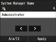 2 | Enter up to 32 characters for the System Manager Name, and tap <Apply>. Entering Text |