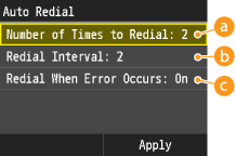 Off On Number of Times to Redial 1 to 2  to 10 (times) Redial Interval 2  to 99 (min.) Redial When Error Occurs Off On  |