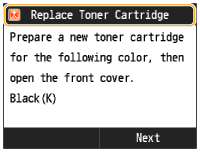 Use only toner cartridges intended for use with this machine. For information on the supported Canon genuine toner. ConsumablesDo not replace toner cartridges until the message prompting you to do so appears. The color of the toner to be replaced is displayed on the display. If multiple toner cartridges must be replaced, replace the toner cartridges in the following order: Black, Yellow, Magenta, Cyan. If you continue copying or printing in black-and-white after cyan, magenta, or yellow toner runs out, do not remove the depleted toner cartridges from the machine. |
