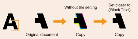 If copy results of black or blackish text are not satisfactory, you can improve the color reproducibility with this adjustment. This adjustment value can be set independently in the feeder and platen glass.